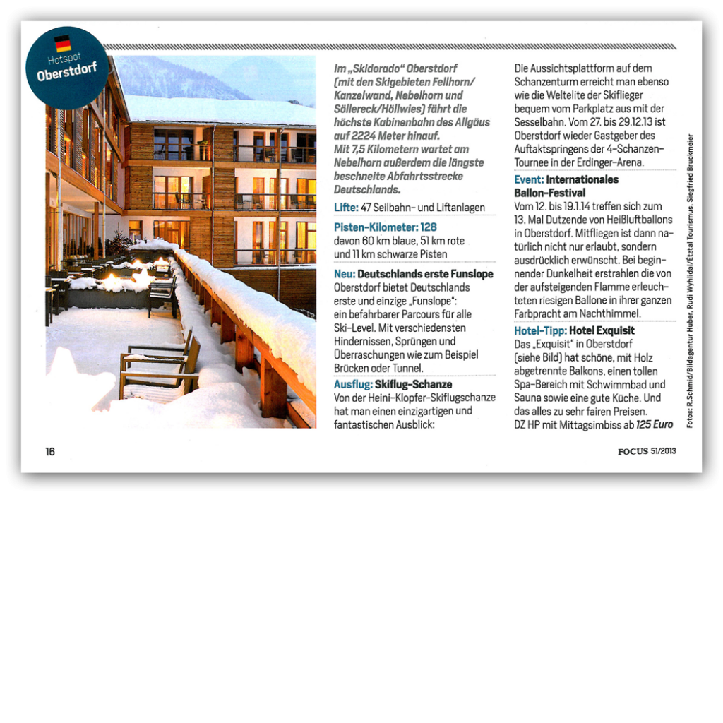 Selbstverständlich darf Oberstdorf in diesem Reigen nicht fehlen – immerhin gibt es am Nebelhorn die längste beschneite Abfahrtstrecke Deutschlands. Weil das Hotel Exquisit den Redakteuren bei ihrer Recherche positiv aufgefallen ist, haben sie es gleich zur Hotelempfehlung in ihrem Artikel über Oberstdorf gemacht!”