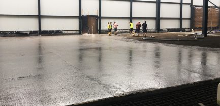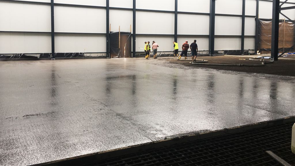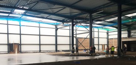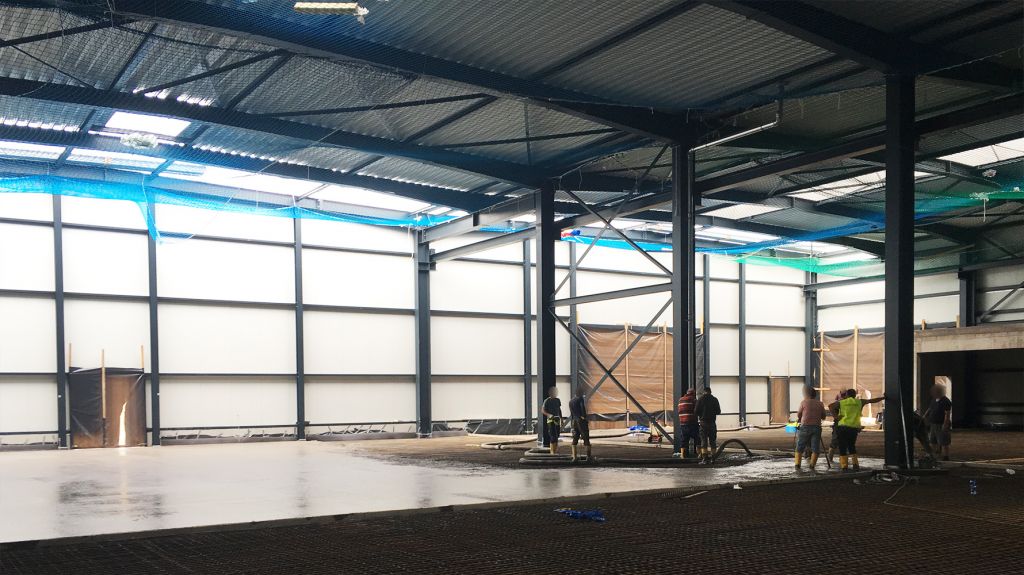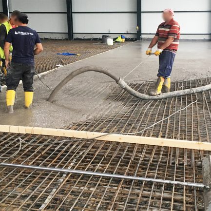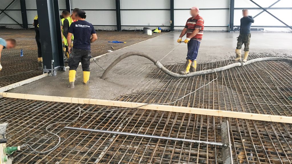 Nachdem im Juni bereits die Stahlkonstruktion der Rohrhalle gestellt wurde und die Bewehrung der Bodenplatte stattfand, erfolgte jetzt der nächste große Schritt des Bauvorhabens mit der Betonage der Bodenplatte.