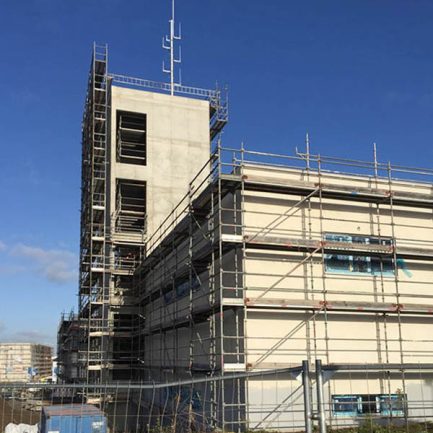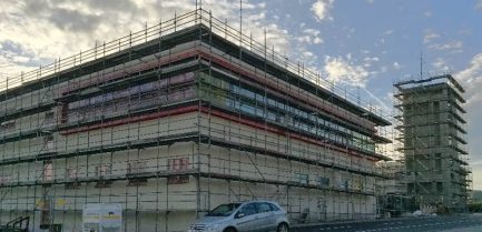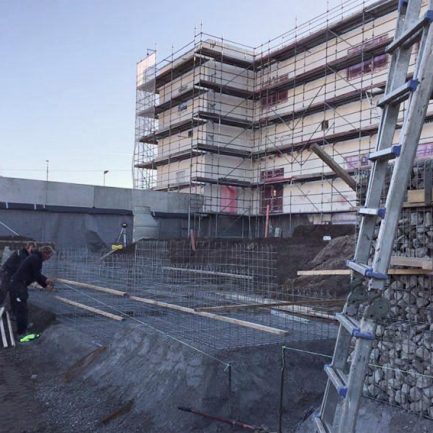 Im November 2019 wurde der Parkplatz ausgehoben und die Grundleitung verlegt. Im Außenbereich wurde der Boden durch Schotter ausgetauscht und die Gabionenwand gestellt. Außerdem wurde der Untergrund der Außentreppen vorbereitet. Die Trockenarbeiten in der Feuerwache sind derweil im vollen Gange, der Estrich wurde verlegt und die Fenster montiert. Die angehängten Fotos zeigen sowohl die Innen-, Außen- als auch die Fassadenarbeiten.