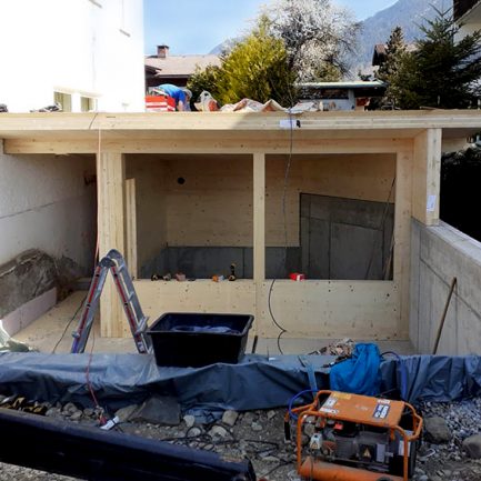 Die finnische Außensauna in Oberstdorf wird momentan in Holzbauweise ausgeführt. Die nächsten Schritte des Bauprojektes sind das Schlitzen der  Bodenplatte, sowie die Verlegung der Abwasserleitungen. Es erfolgt die Montage der Eisdusche und der regulären Dusche. Die Planung befindet sich in den letzten Zügen. Fertiggestellt werden soll der Umbau der Außensauna mit Terrasse bis Ende Mai. November/Dezember ist die Renovierung der übrigen Bereiche geplant.