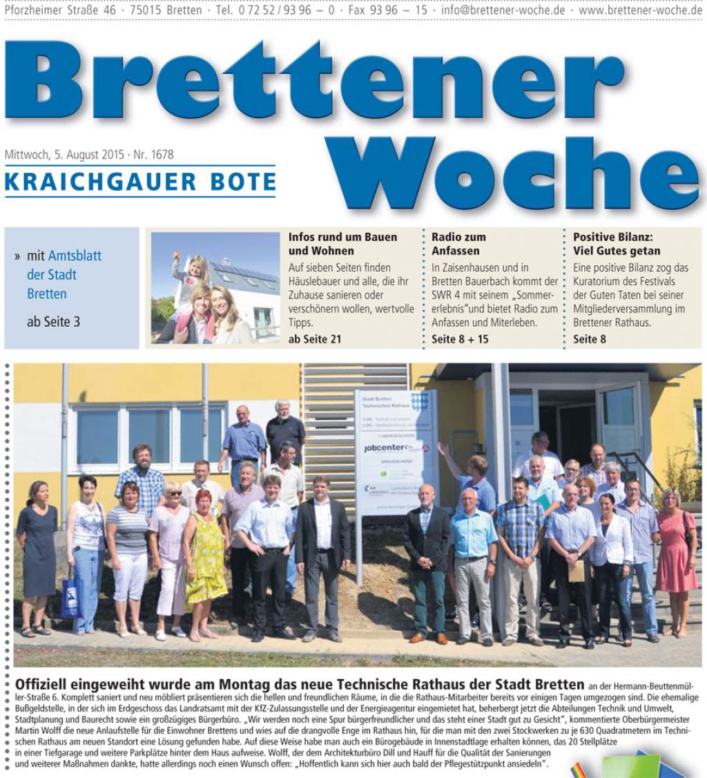 „[…] Komplett saniert und neu möbliert präsentieren sich die hellen und freundlichen Räume, in die die Rathaus-Mitarbeiter bereits vor einigen Tagen umgezogen sind. Die ehemalige Bußgeldstelle, in der sich im Erdgeschoss das Landratsamt mit der KfZ-Zulassungsstelle und der Energieagentur eingemietet hat, beherbergt jetzt die Abteilungen Technik und Umwelt, Stadtplanung und Baurecht sowie ein großzügiges Bürgerbüro. „Wir werden noch eine Spur bürgerfreundlicher und das steht einer Stadt gut zu Gesicht“, kommentierte Oberbürgermeister Martin Wolff die neue Anlaufstelle für die Einwohner Brettens und wies auf die drangvolle Enge im Rathaus hin, für die man mit den zwei Stockwerken zu je 630 Quadratmetern im Technischen Rathaus am neuen Standort eine Lösung gefunden habe. […] Wolff, der dem Architekturbüro Dill und Hauf für die Qualität der Sanierungen und weiterer Maßnahmen dankte, […].