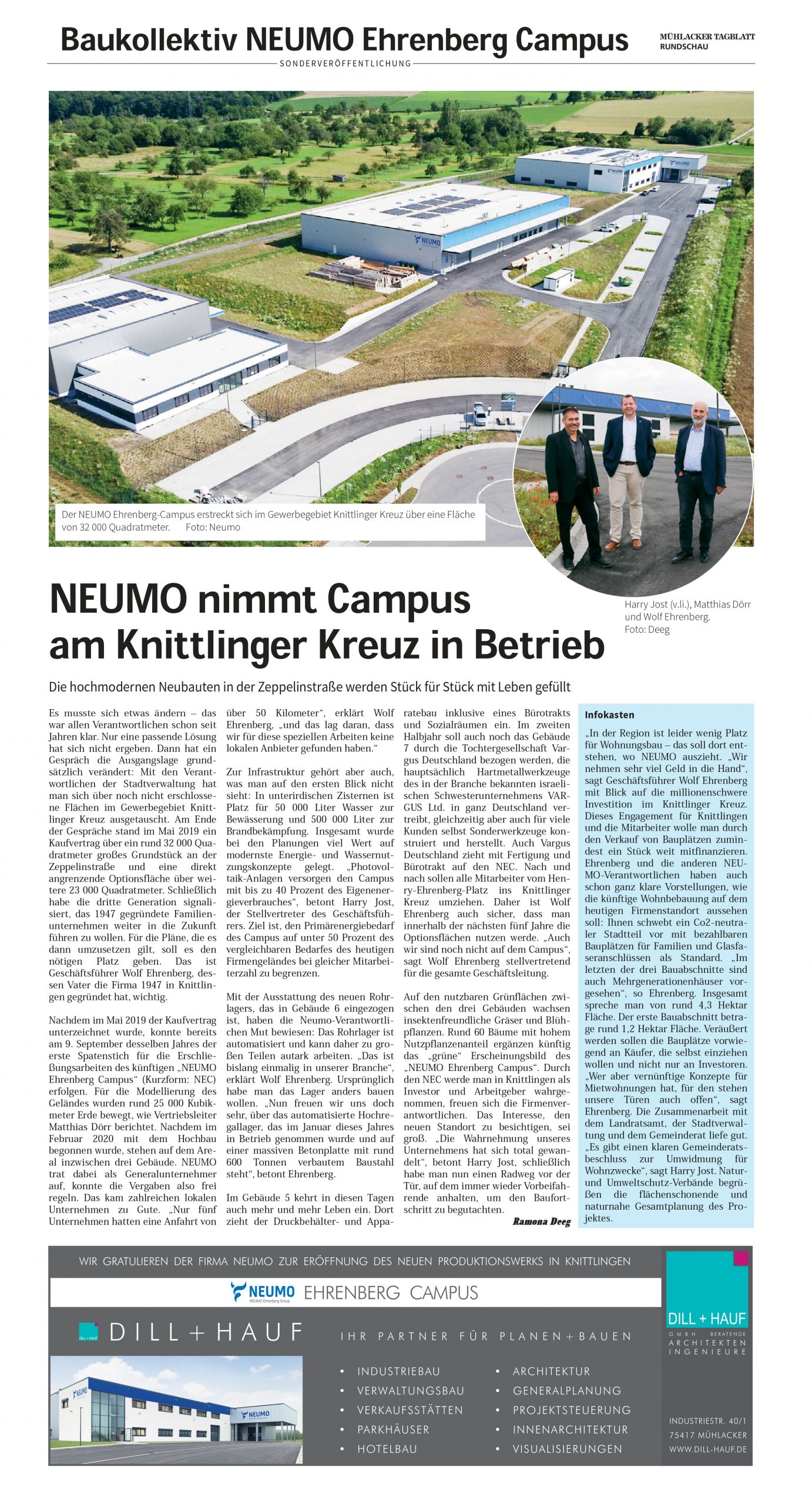 Nachdem im Mai 2019 der Kaufvertrag unterzeichnet wurde, konnte bereits am 9. September desselben Jahres der erste Spatenstich für die Erschließungsarbeiten des künftigen „NEUMO Ehrenberg Campus“ (Kurzform: NEC) erfolgen […].“