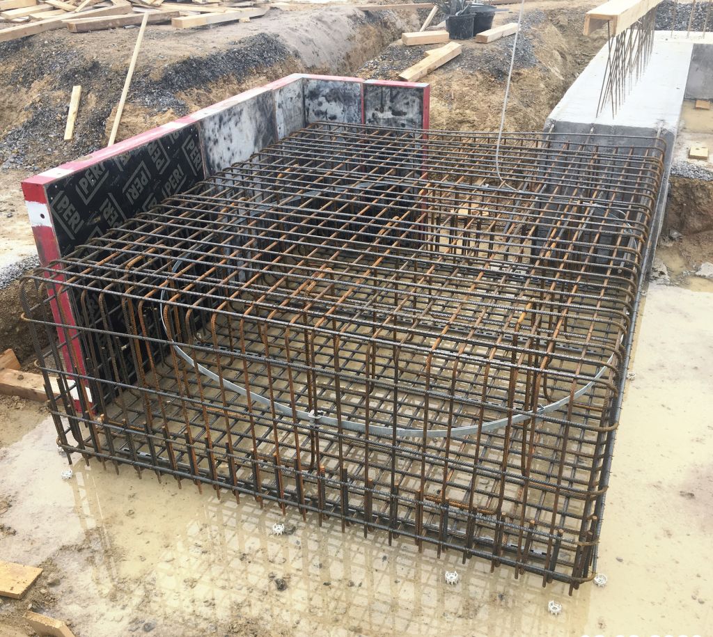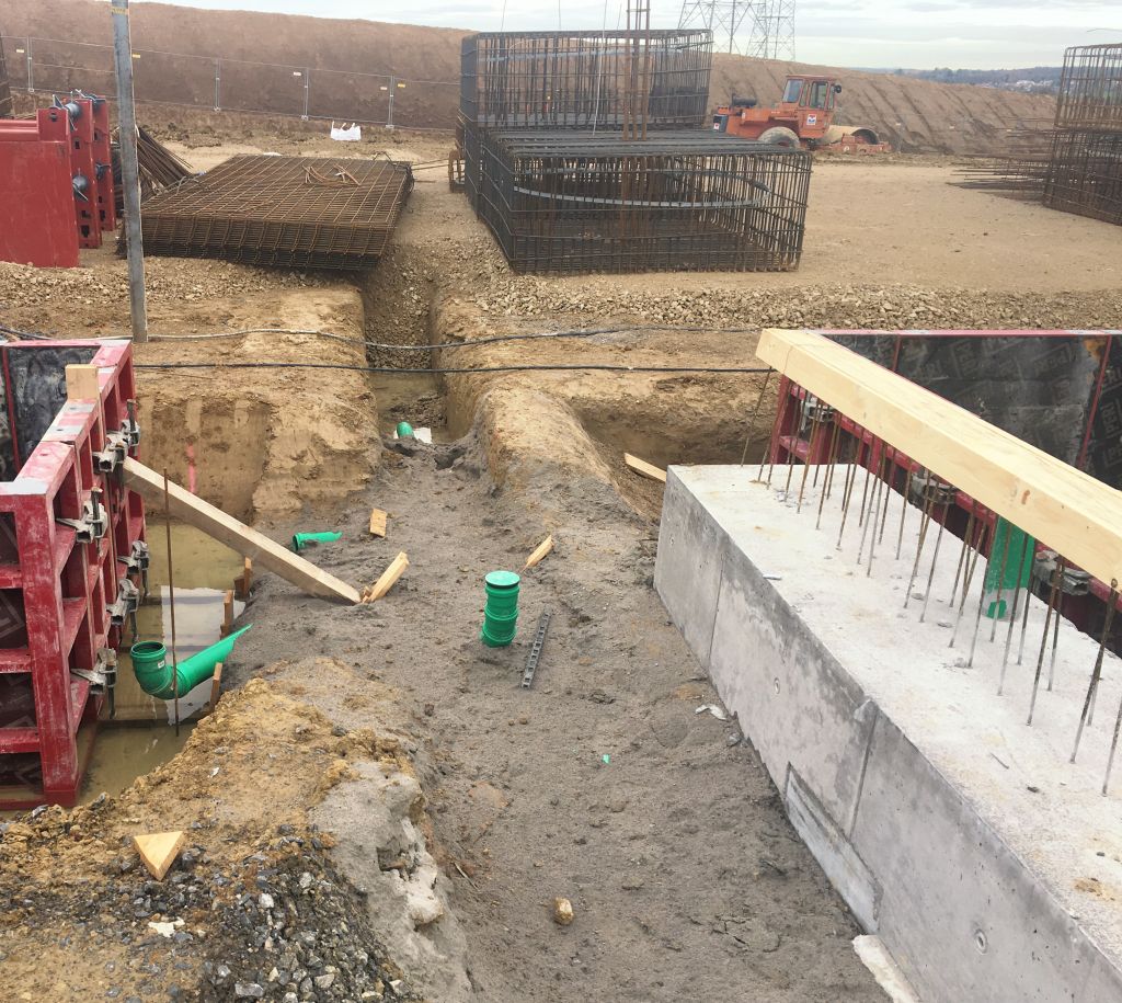 Die Baustelle der Firma Neumo in Knittlingen schreitet voran. Momentan beschäftigen sich die BauarbeiterInnen mit der Verlegung der Grundleitungen. In der Rohrhalle sind die Streifenfundament bereits fertig gestellt.