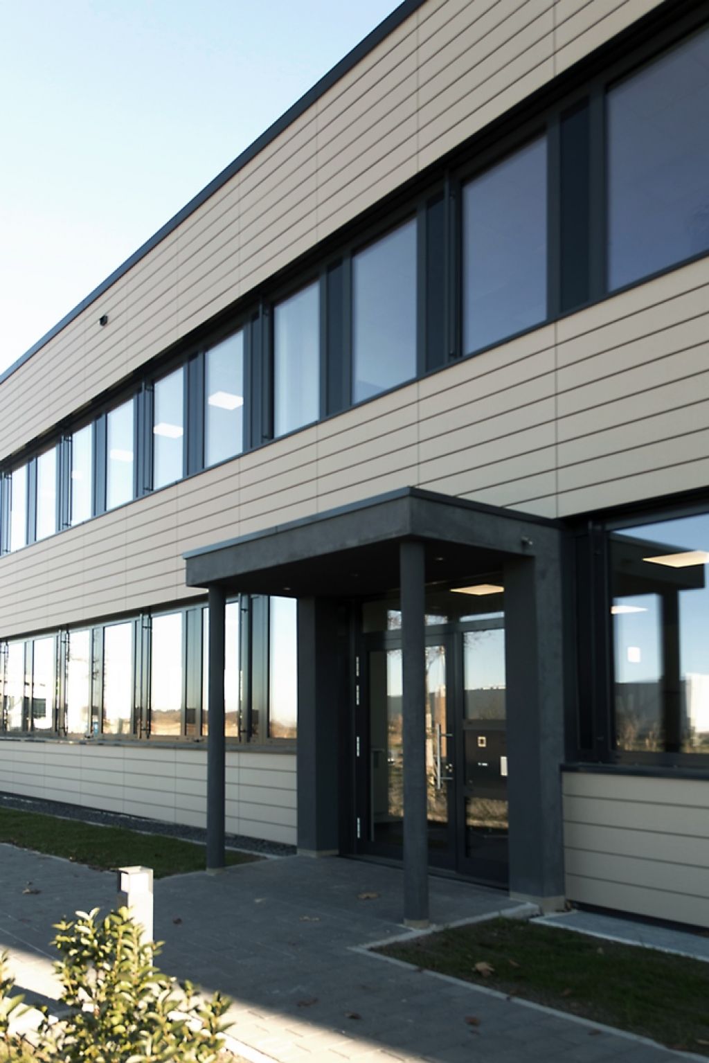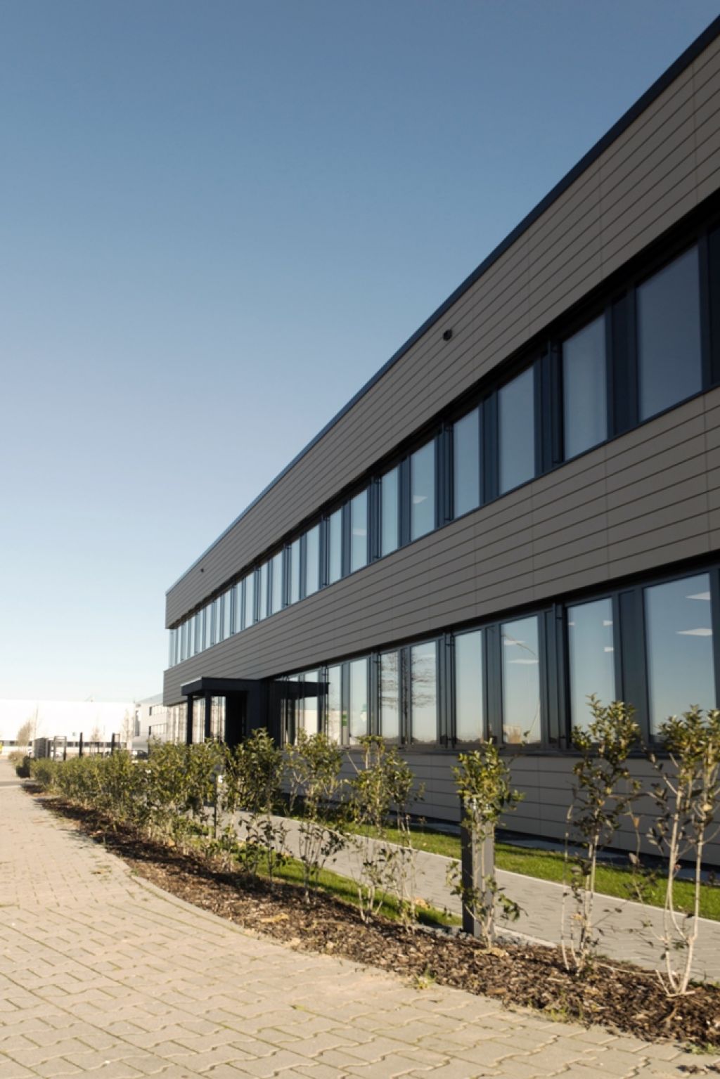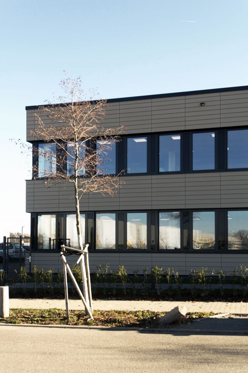 Die Westfassade besticht durch die Kombination der grauen Keramikziegel mit den durchgehenden, anthrazitfarbenen Fenster-bändern. Die Hallenfassaden bestehen aus Isopaneelen in Weißaluminium.