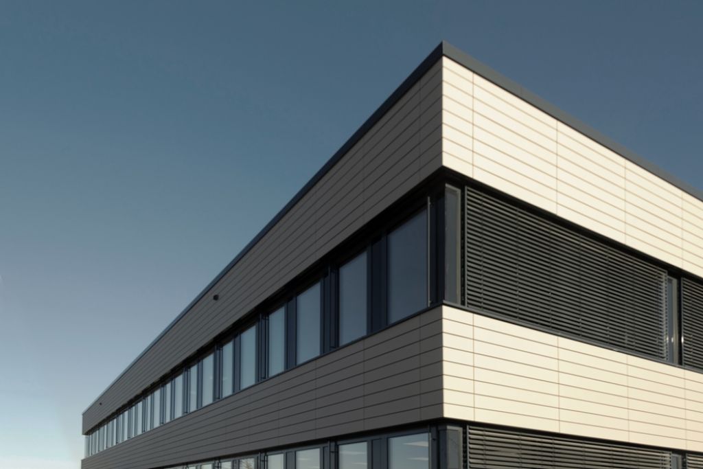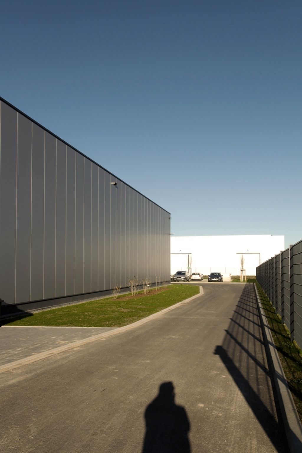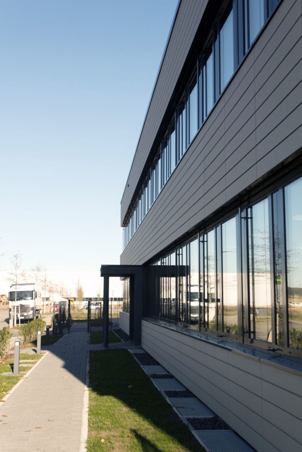 Die Westfassade besticht durch die Kombination der grauen Keramikziegel mit den durchgehenden, anthrazitfarbenen Fenster-bändern. Die Hallenfassaden bestehen aus Isopaneelen in Weißaluminium.