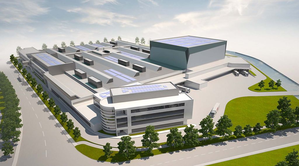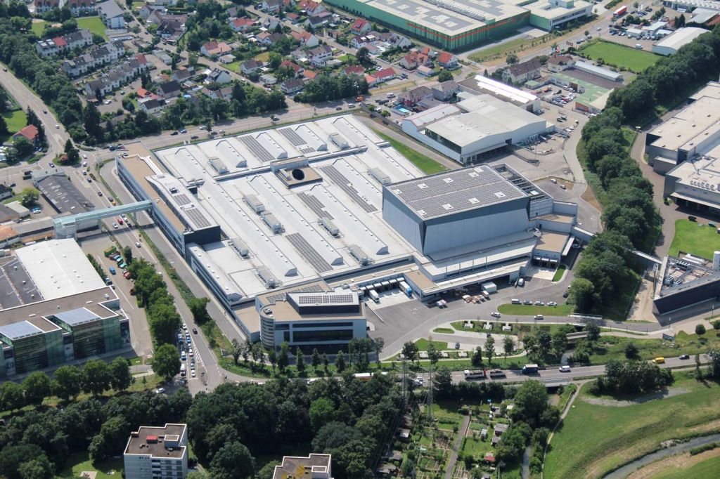 Mit ca. 27.000 m² ist die Produktionshalle das größte Bauteil. Aufgrund des weiten Stützenrasters von 26 x 26m wird die komplette Halle mit Fachwerkträgern überspannt. Die Halle ist unterteilt in 17 Maschinenfelder mit einer durchschnittlichen Größe von ca. 1.000 m², welche von einem Netzt von 4 m breiten Verkehrswegen umschlossen werden. Im Zentrum der Halle befindet sich ein weiterer Massivbau mit einem ovalen Atrium, von welchem aus alle Hallenteile überblickt werden können. Der Zentralbau ist über einen Highway mit dem „Randbau“ verbunden.
