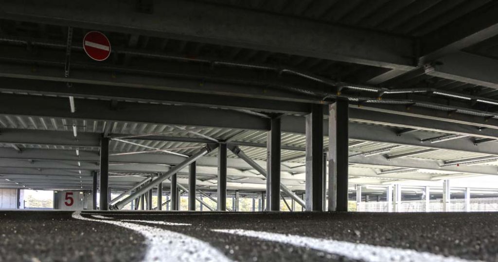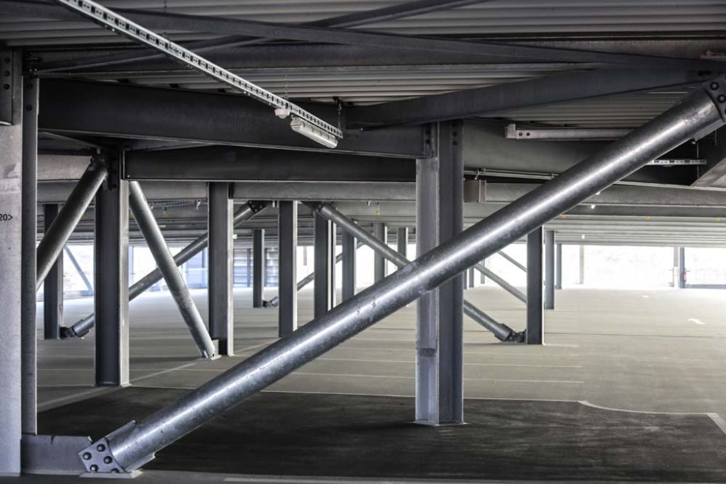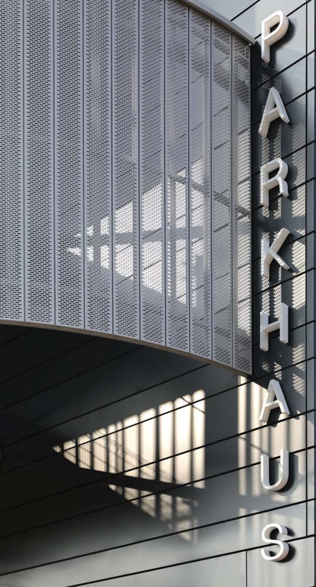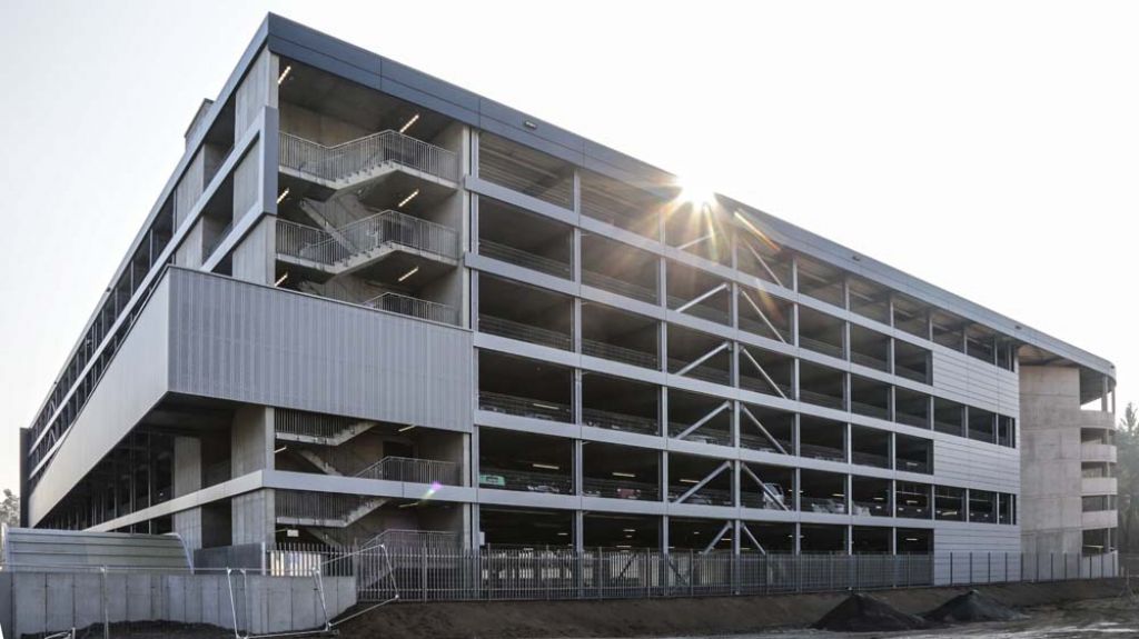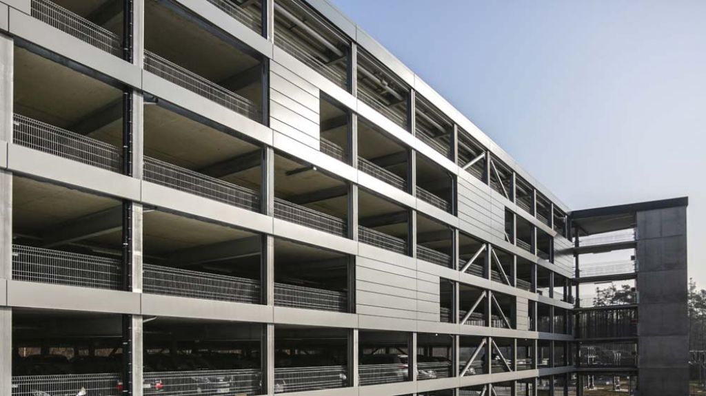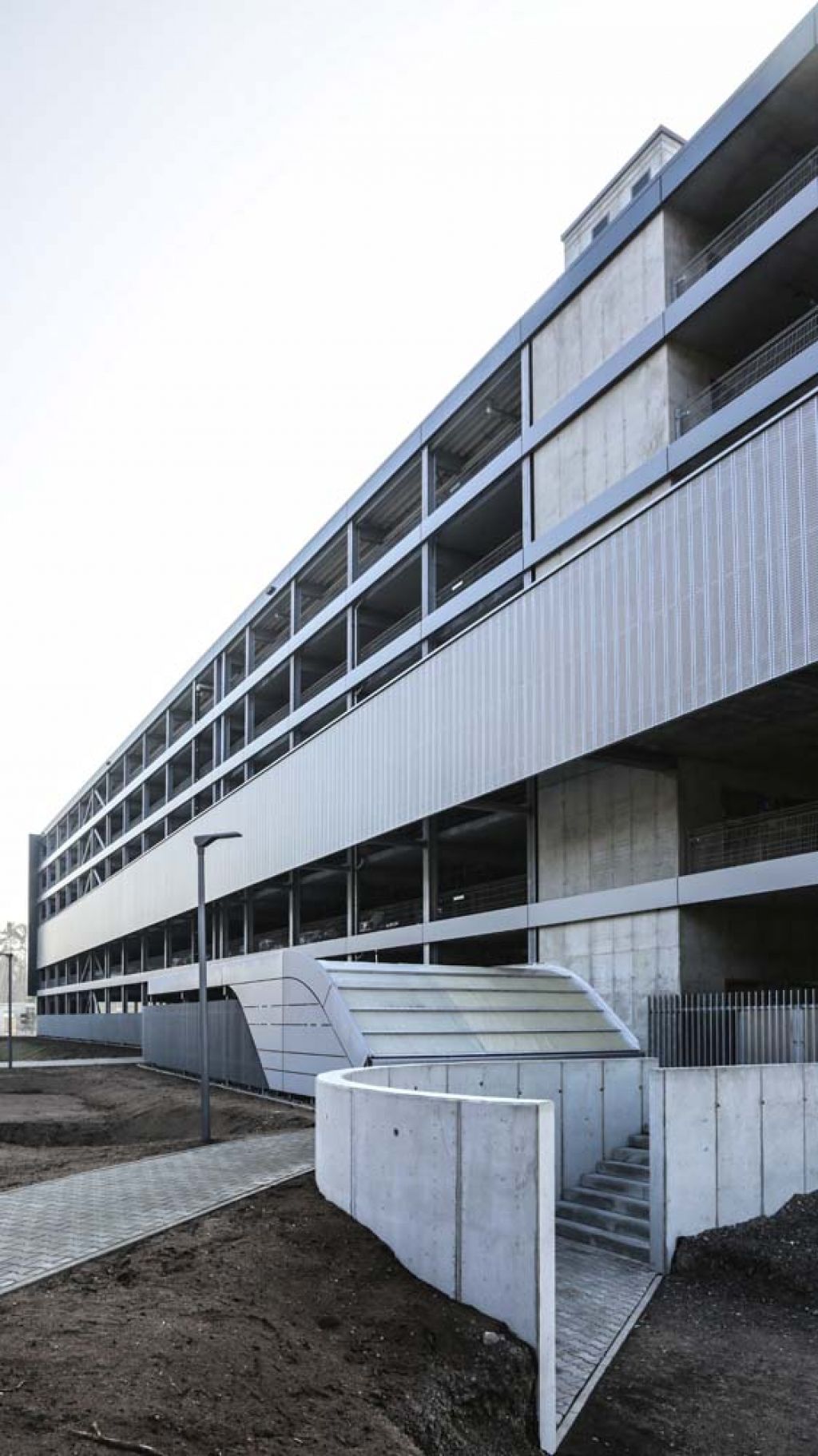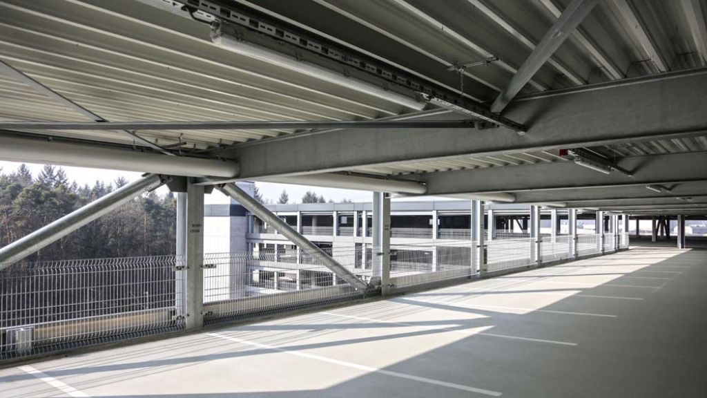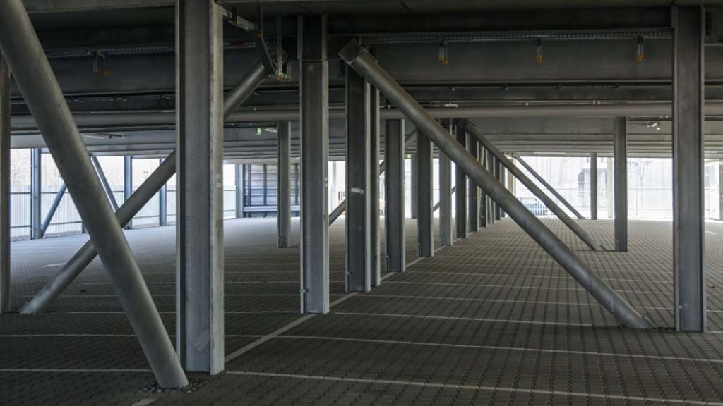 Das Parkhaus wird in Stahlkonstruktion ausgeführt. Die einzelnen Ebenen werden durch eine großzügige Spindel miteinander verbunden. Die Überdachung wird zur Stromerzeugung, mit Photovoltaikmodulen ausgestattet.