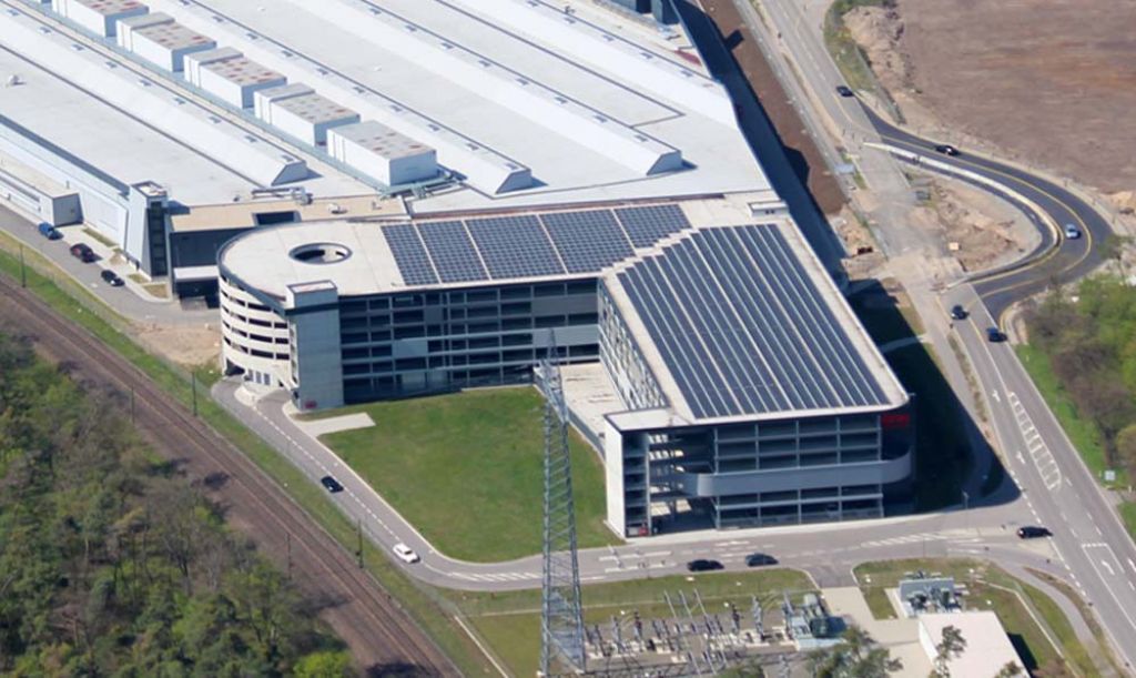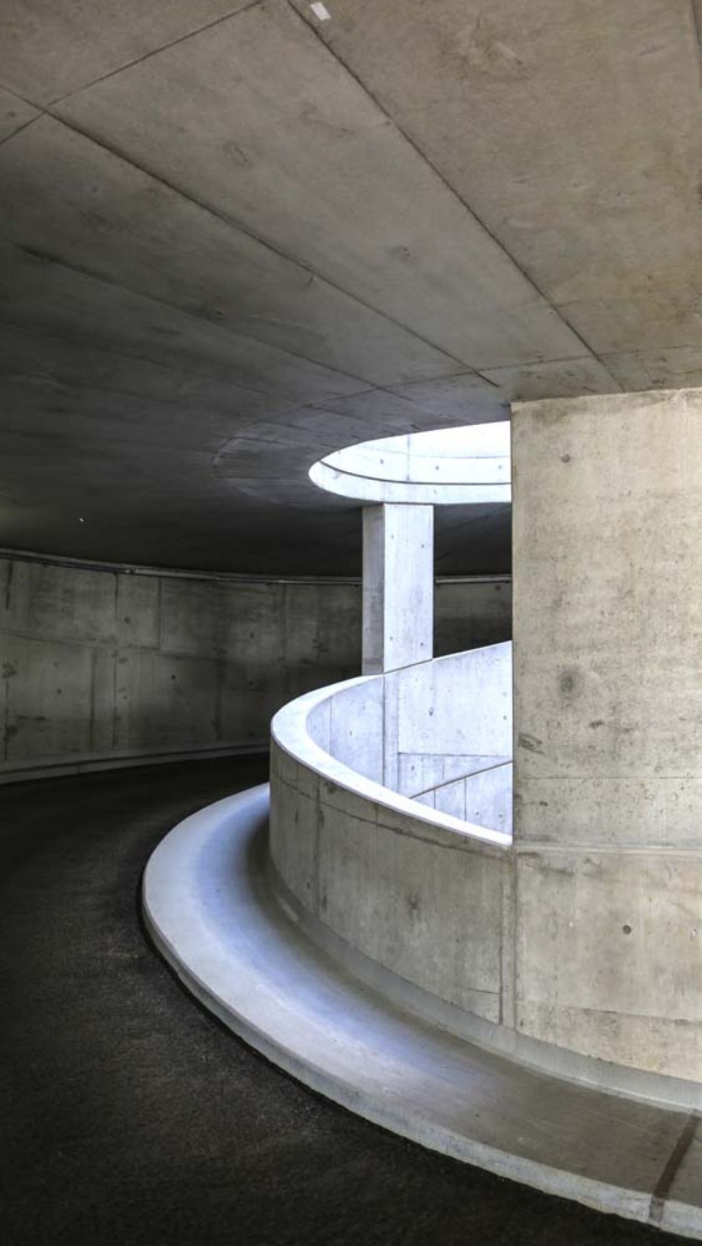 Im Erdgeschoss sind Besucherfahrzeug-, in den fünf oberen Ebenen die Mitarbeiterstellplätze untergebracht. Zusätzlich findet man auf den ersten Ebenen auch Stellplätze mit Ladestationen für Elektrofahrzeuge.