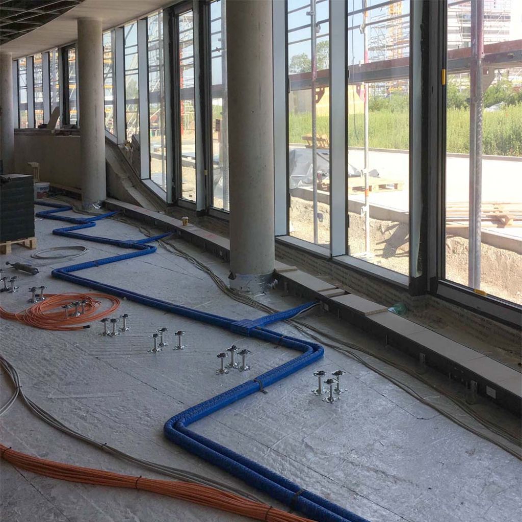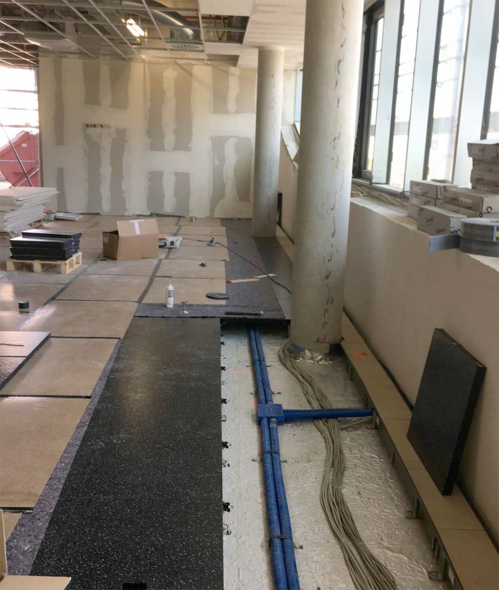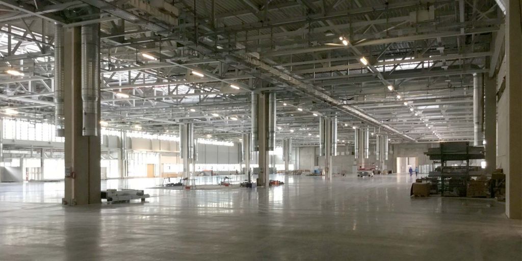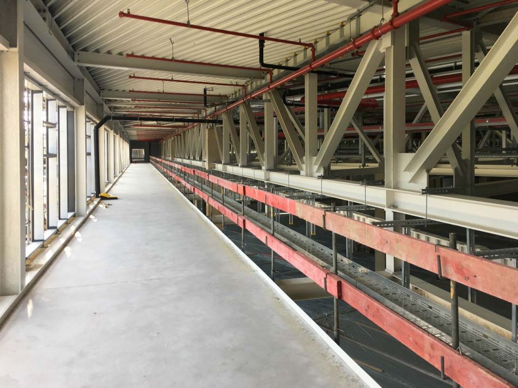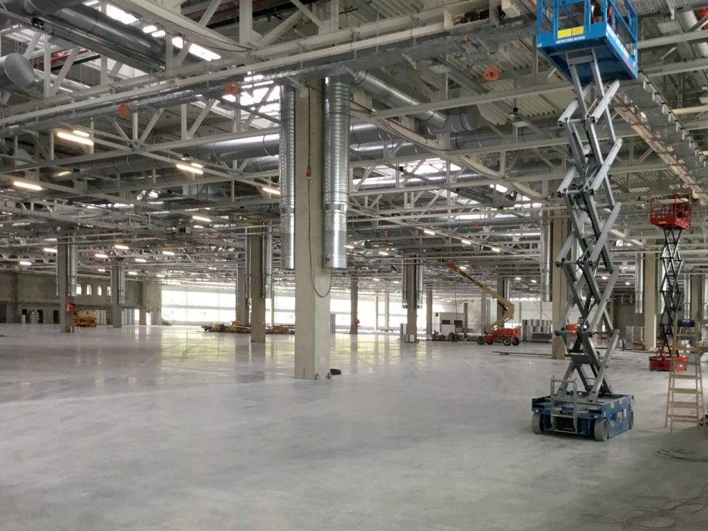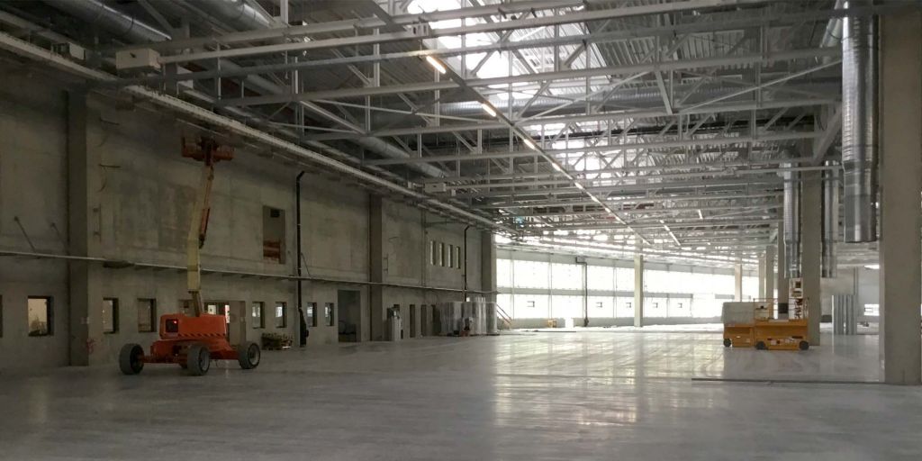 Die Arbeiten am Großprojekt Halle Süd laufen planmäßig voran. In der Produktionshalle werden die letzten Bereiche der Bodenplatte beschichtet und die Technik weiter installiert. Die Fassade und das Dach sind bis auf wenige Anschlüsse fertig. Im angrenzendem Verwaltungs- und Sozialgebäude sieht es analog zur Halle aus, der Innenausbau läuft auf Hochtouren: der Doppelboden wird verlegt, abgehängte Decken und die Sanitärräume werden fertig gestellt.