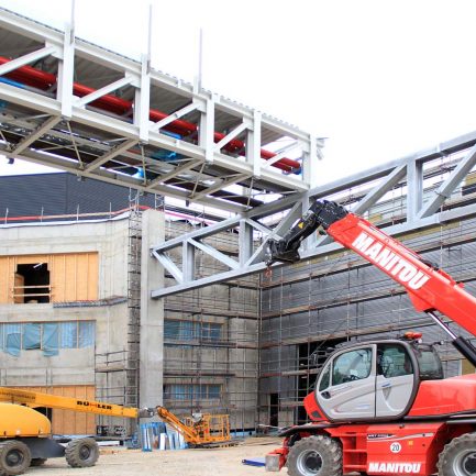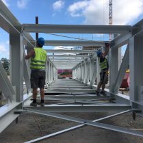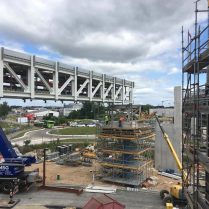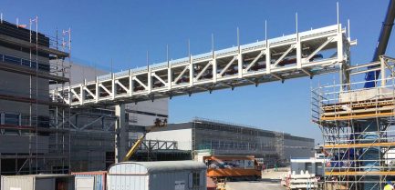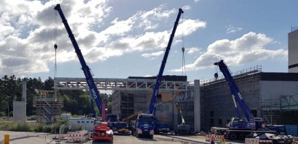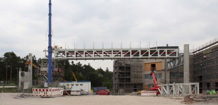 Das Einheben des ersten Abschnittes der Medienbrücke erfolgte Ende Juni (KW 25). Die ca. 32 m lange und ca. 42 tonnen schwere Konstruktion wurde mit zwei Autokränen auf die Auflager eingehoben und befestigt. Davor wurden am Boden die Installationsrohre montiert. Die Medienbrücke wird in 3 Abschnitten zusammengebaut und führt dann über die Straße K3531.